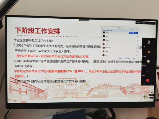 疫情的突然来袭,使今年2016级本科论文的指导任务更加艰巨。针对无法对学生进行面对面交流指导的现实情况,学院专门召开本科论文主题会议进行研讨,制定出富有建设性的方案,确保论文工作的总体质量。学院以学生为本,在指导时间上把握得当,严格按照论文格式规范,减少了学生在排版和格式上出错等常见问题;为毕业生设立QQ、微信群,方便指导教师及时与学生进行讨论、沟通并及时发布信息给学生。