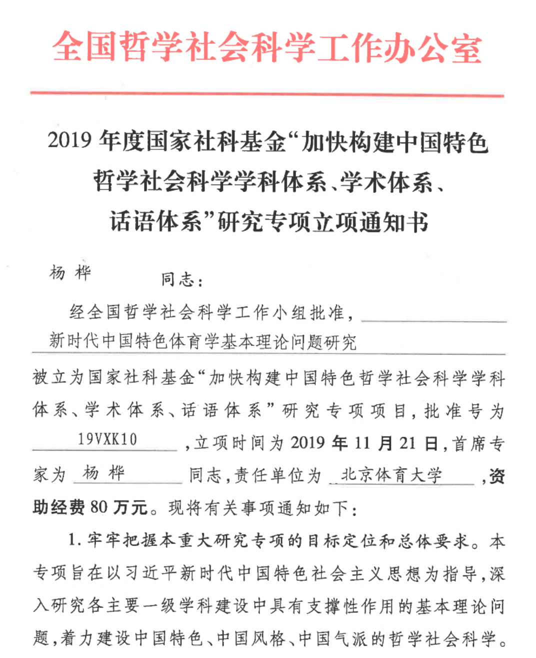 近日,经全国哲学社会科学工作小组批准,由新葡萄杨桦教授担任首席专家的“新时代中国特色体育学基本理论问题研究”被批准为国家社科基金“加快构建中国特色哲学社会科学学科体系、学术体系、话语体系”重大研究专项。