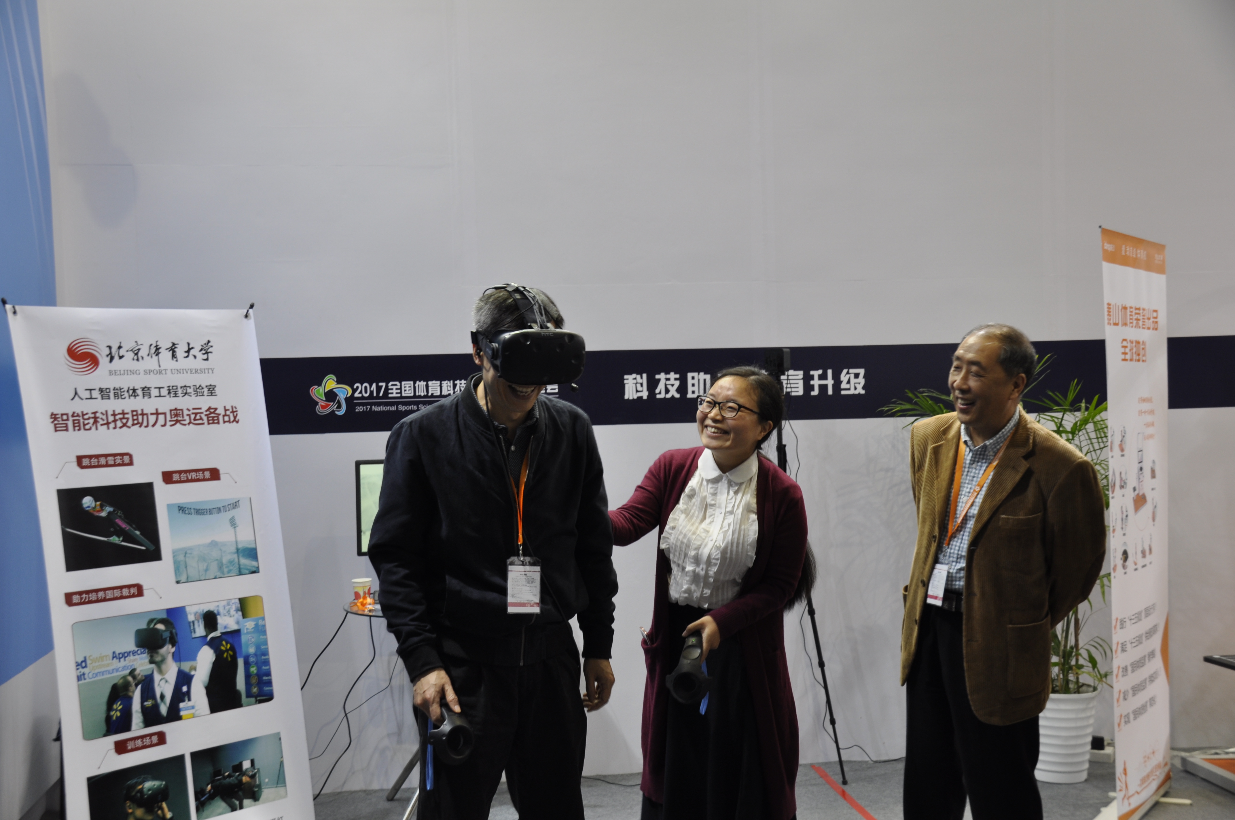 展会上,胡扬副校长陪同李业武司长、国家体育总局科研所领导、各大体育院校领导和多位专家、学者参观体验了新葡萄的成果展厅,听取了新葡萄各项科技成果的汇报。李业武司长等领导亲自体验了跳台滑雪虚拟场景,对虚拟现实技术场景在体育应用,尤其是训练和教学中的应用前景给予了积极的肯定。