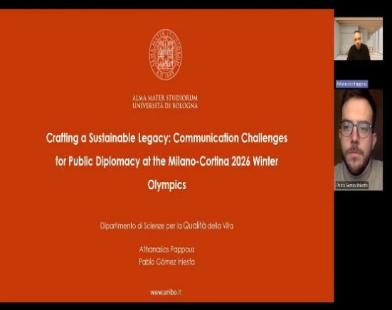 赛提斯·巴布斯(Athanasios Pappous)教授与他的博士生Iniest采取线上视频参会方式,以《打造可持续遗产:2026年米兰——科尔蒂纳冬奥会公共外交的传播挑战》为题发表了主题报告。他基于公共外交传播的视角,为冬奥会“软实力”构建与冬奥遗产可持续发展,提出应针对不同受众群体采取适应性的传播策略。