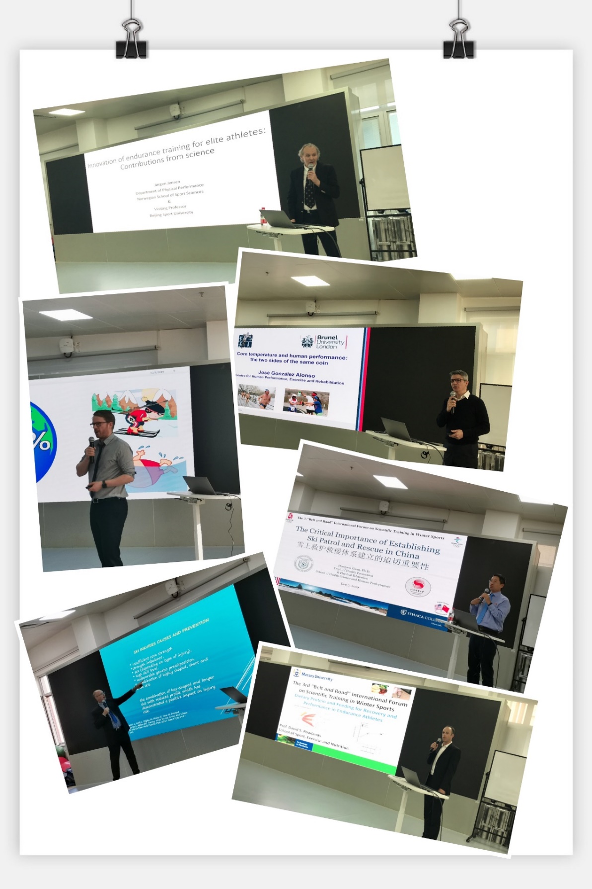 论坛报告环节,6名外国专家和2名新葡萄专家分别对自己的研究领域进行了报告。来自挪威体育学院的Jorgen Jensen 教授主要从耐力训练的分子适应和优秀耐力运动员的基因变异两方面进行了阐述;来自英国布鲁内尔大学的Jose Gonzalez Alonso教授主要从机体对高温和低温环境中运动的应激反应以及核心温度的变化来探讨温度对人类运动表现的影响;来自丹麦哥本哈根大学的Morten Hostrup博士介绍了优秀运动员的呼吸并发症和抗哮喘手段;来自意大利博洛尼亚大学的Antonio Cicchella教授对滑雪生物力学和运动损伤的原因与预防进行了详细阐述;来自新西兰梅西大学的David S.Rowland教授主要从蛋白质的补充方面来探讨耐力运动员恢复和提高运动表现的合理营养与膳食;来自美国伊萨卡大学的关红卫博士介绍了滑雪的危险性以及中国滑雪基地建立救援团队的必要性。新葡萄的刘卉教授和汪军教授分别展示了近两年在冬季项目方面的研究成果。