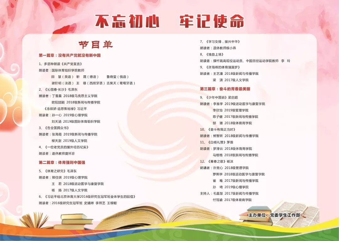 本届金牌朗读者活动分为“没有共产党就没有新中国”“体育强则中国强”“奋斗的青春最美丽”三个篇章,展现了共产党人“不忘初心、牢记使命”的拼搏精神。