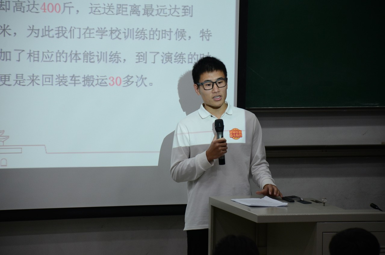 彩车疏散志愿者代表,来自竞技体育学院2018级现役班空手道专项的李忍忍同学,对彩车疏散团队任务细节、训练生活、国庆当天的所见所闻做了详细讲述,分享了自己以及其他参与彩排者在枯燥训练中的快乐。参会的同学们了解到原来彩车顺利行进的背后,竟是有这么多力量的支撑。