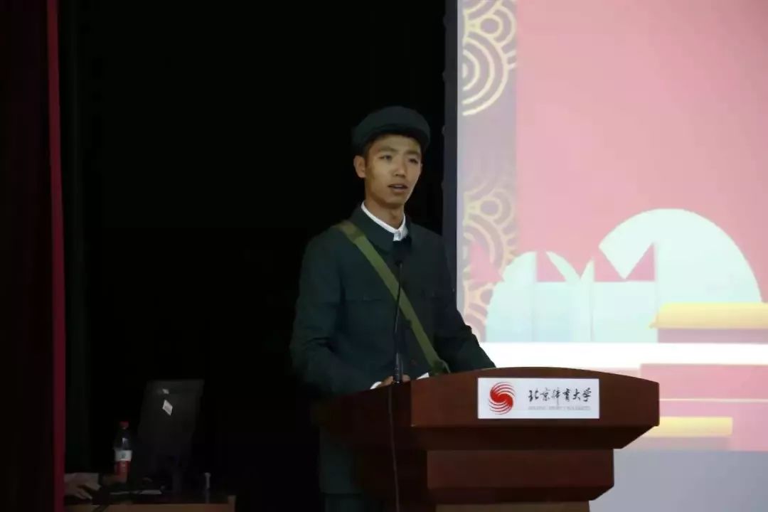 群众大联欢联欢晚会团队代表,来自艺术学院2018级的韩杰同学,用照片和视频生动地为我们讲述了他参与排练的原因、他们排练过程中的日常和小乐趣,会场内不时响起同学们的阵阵笑声。其中,他特别介绍了一位带伤也要坚持参加排练的同学,他表示,这位同学让他十分敬佩,是“使命在肩,奋斗有我”的践行者,是我们应该学习的榜样。
