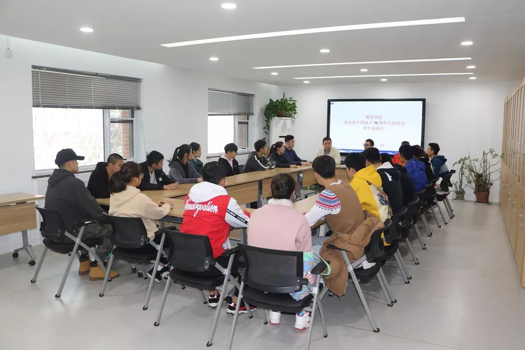 除国庆宣讲外,教育学院组织参演学生召开了座谈分享会。会上,6名参与国庆活动的学生代表相继发言。他们表示,感谢学校创造的平台,非常有幸能够参加新中国成立70周年庆祝活动,能够于国庆节当天在首都天安门广场上为伟大的祖国庆祝生日。会上,大家对参演的同学们给予了极大的肯定,纷纷表示同学们面对困难不退缩、不放弃、不认输、坚持不懈、顽强拼搏,认真完成了国家交代的任务,真正践行了“使命在肩,奋斗有我”精神,值得每位同学学习。希望同学们以此为契机,抢抓机遇,接续奋斗,以优异的学业成绩为祖国献礼。