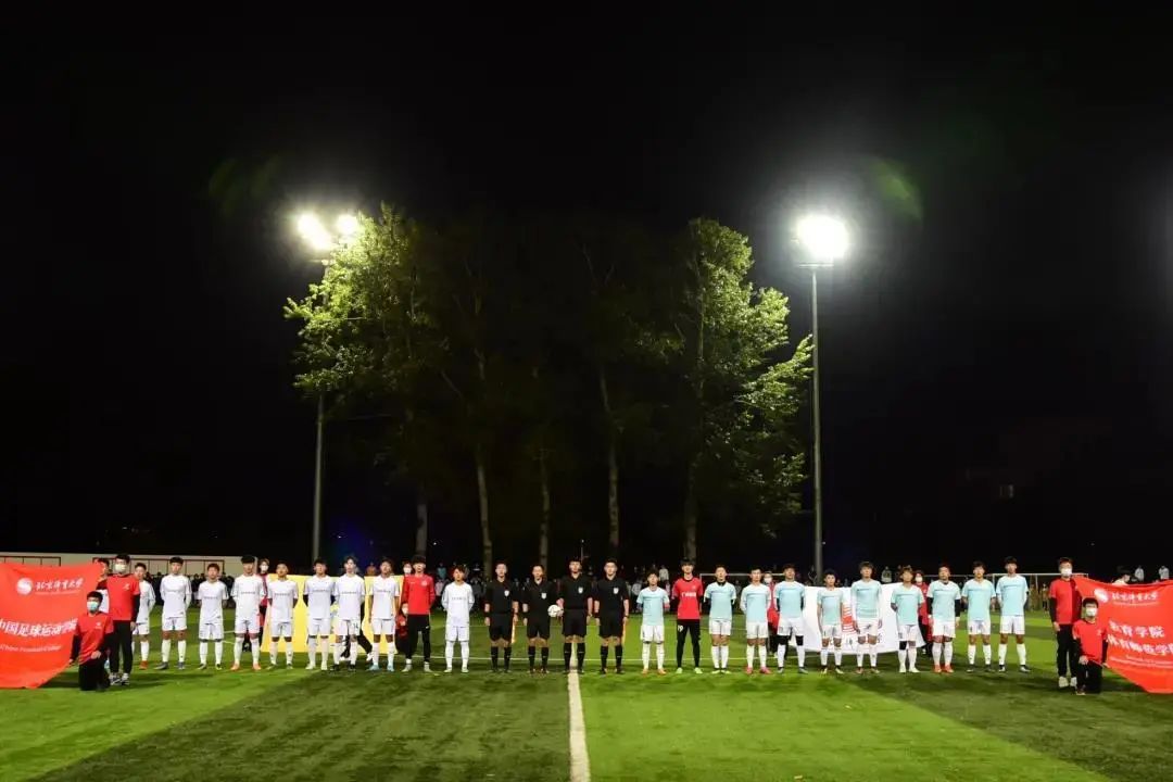 公平竞赛旗、新葡萄AMG官方网站校旗、中国足球运动学院院旗、教育学院院旗以及裁判员、双方运动员先后入场。与会人员全体高唱国歌。双方队员进行握手、挑边仪式后,周启迪为比赛开球后,激烈的争夺正式开始
