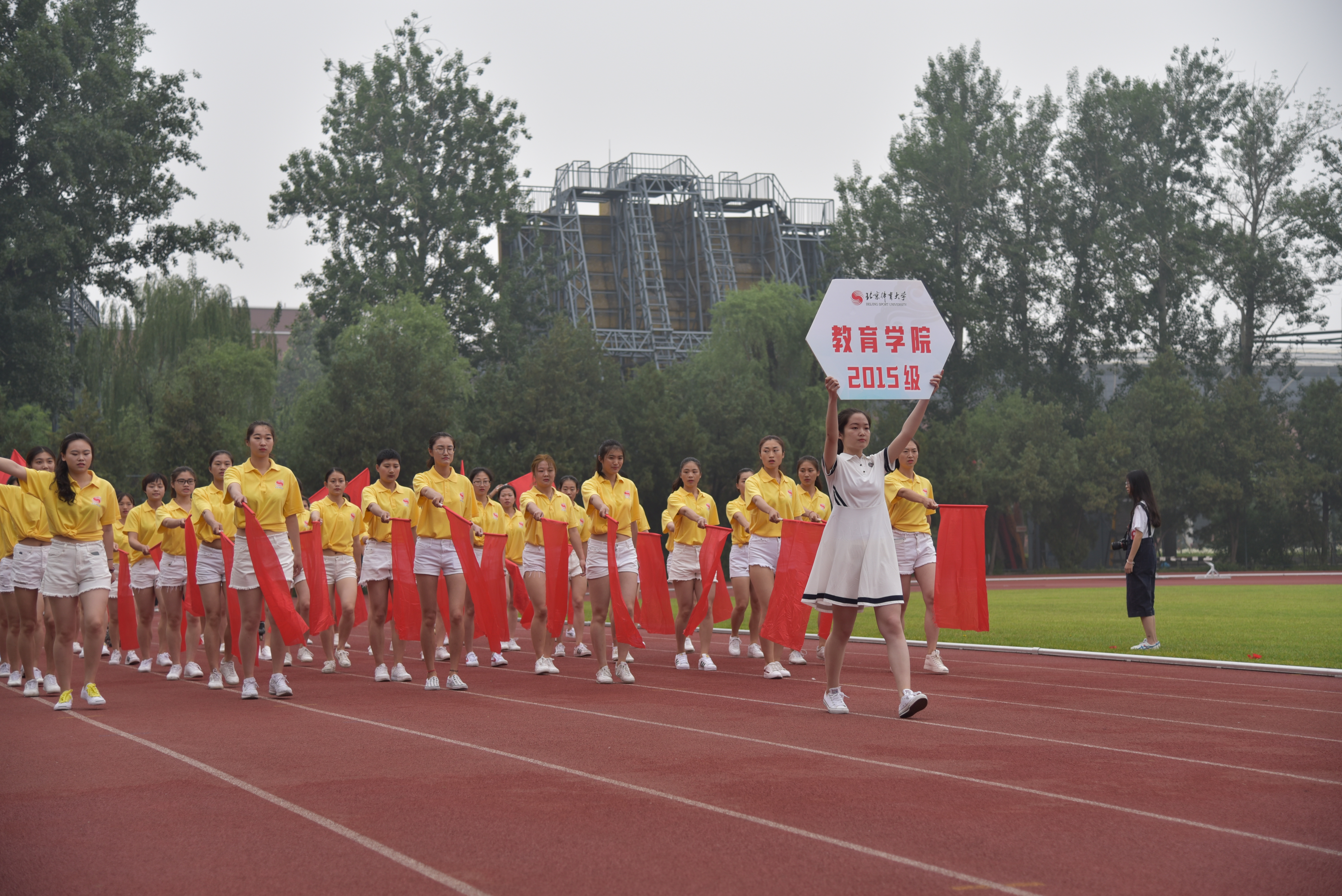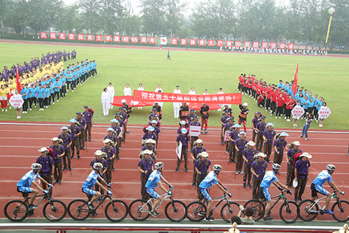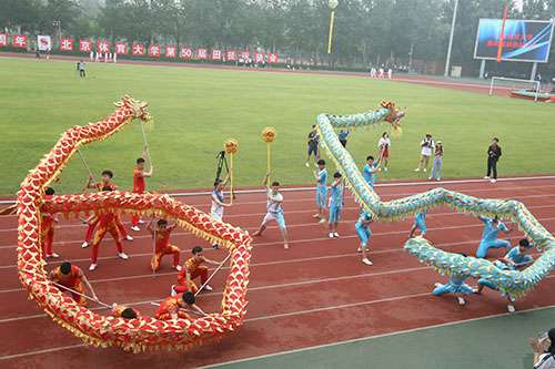 2018年,恰逢新葡萄建校65周年,入场式尽显欢乐气氛。武术学院方阵舞动着两条巨龙,以生动流畅、轻捷矫健的姿态振奋登场,在主席台前摆出“65”的造型,向建校65周年献礼。校友方阵首次出现在运动会当中,他们之中既有毕业不久的年轻人,也有年逾古稀的老校友。他们喊出 “我爱新葡萄,祝新葡萄生日快乐”的口号,铿锵有力的声音和富有感情的表达传达着他们对母校的真挚情感与美好祝愿。北京市公安局反恐特警校友方阵的整齐队列出现在入场式上,在公安战线上他们屡立战功,在运动场上他们同样庄严威武、斗志昂扬。最后,平昌冬奥会闭幕式上表演“北京八分钟”的参演团队代表进行了体育技能展示。