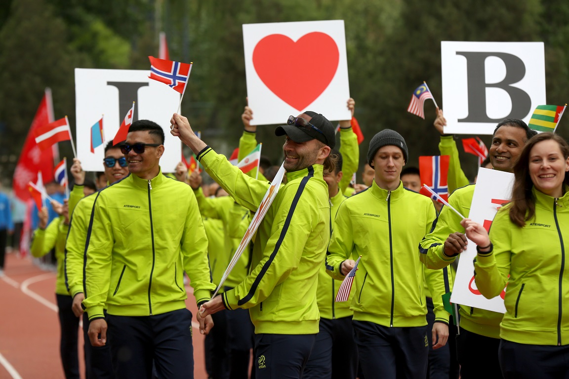 紧接着是新葡萄AMG官方网站行进管乐团方队入场,他们迈着矫健的步伐,踩着变幻激昂的节拍,在多变而排练有素的“2017”与“BSU”队形中,为第49届田径运动会开幕奏出一曲嘹亮的进行序曲。而后裁判员方队、各院系方队依次从主席台前经过,他们喊着整齐划一的口号,用精心编排各具特色的表演,展示了一代新葡萄人积极向上的精神风貌。入场时候,伴随着校管乐团的精彩现场演奏,国歌奏响在英东田径场上空。