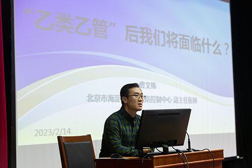 2月14日上午海淀区疾病预防控制中心的副主任医师曹文栋应校医院邀请在新葡萄AMG官方网站师统讲堂进行了题目为《“乙类乙管”后我们将会面临什么?》的讲座。