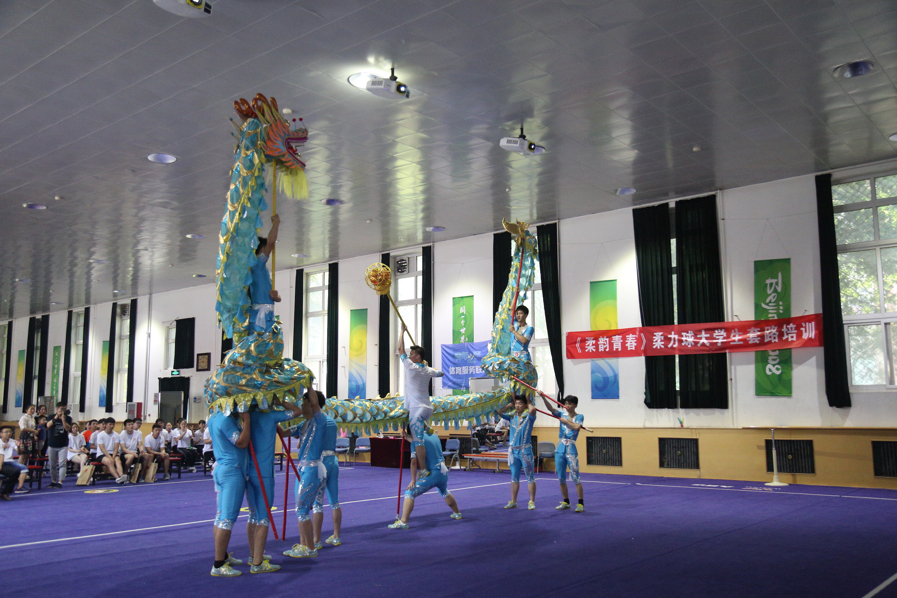 在培训正式开始前,校团委精心安排了龙狮队的舞龙、舞狮表演,柔力球的单人、双人、集体表演,让大家通过观看表演对柔力球项目有初步的认识并激发他们的兴趣。随后,段全伟进行柔力球理论课的授课,下午进行柔力球技术实践课的授课。