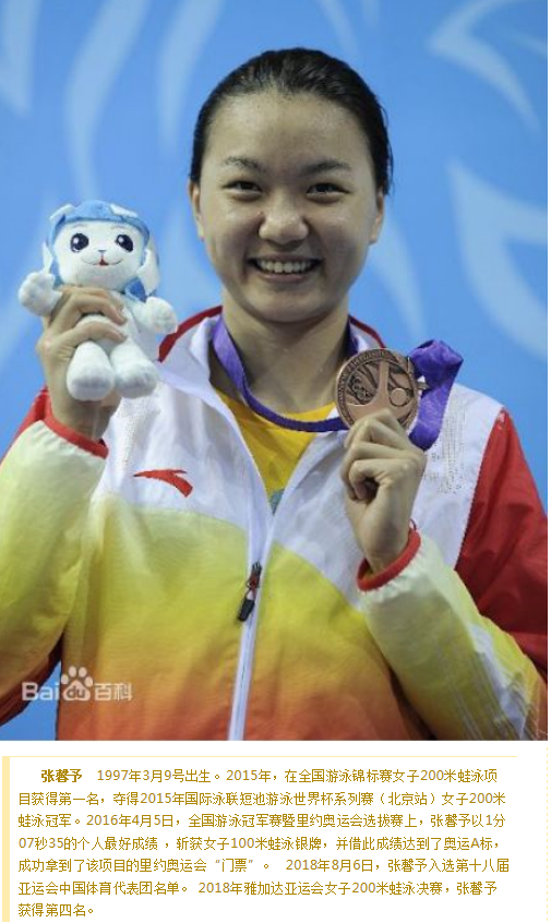 在8月20日举行的亚运会女子200米蛙泳决赛中,中国选手于静瑶以2分23秒31获得该项目亚军,新葡萄竞技体育学院2017级学生张馨予以2分26秒24获得第四名。