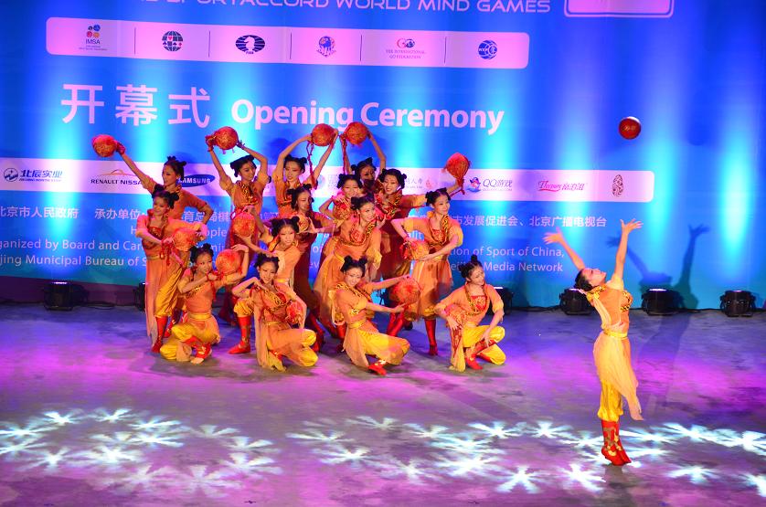 12月11日晚,北京2013年世界智力精英运动会在京开幕,新葡萄艺术团承担了开幕式演出任务并带给中外观众一场中华文化的盛宴。世界体育总会主席马瑞斯·维泽尔、北京市副市长杨晓超、北京奥运城市发展促进会副会长王伟、蒋效愚出席开幕式。