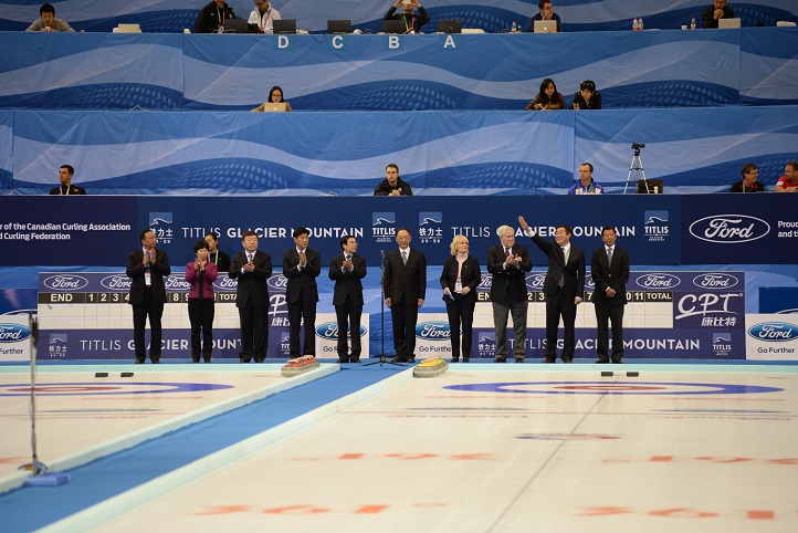 下午2时,“2014年世界男子冰壶锦标赛”正式开始。世界冰壶联合会主席凯特女士,国家体育总局局长、中国奥委会主席刘鹏、北京市市长王安顺、国家体育总局冬季运动管理中心主任赵英刚等多位领导出席开幕式。在管乐团《欢迎进行曲》的轻快伴奏下,各国运动员相继入场。随后全场起立,伴随《义勇军进行曲》的演奏,中华人民共和国国旗缓缓升起。在世界冰壶联合会主席凯特女士宣布比赛开始后,管乐团又演奏了《豪勇七杰》,为比赛点燃了激情,赢得现场观众的热烈掌声。