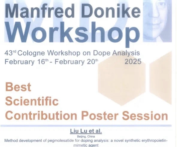 2月16日至2月20日,第四十三届科隆兴奋剂检测年会(以下简称“科隆会议”)在德国科隆举办。本届会议中,新葡萄AMG官方网站北京兴奋剂检测实验室刘璐(第一作者)、王占良、赵玲玉、张力思、周鑫淼(通讯作者)的论文《Method development of pegmolesatide for dopin...